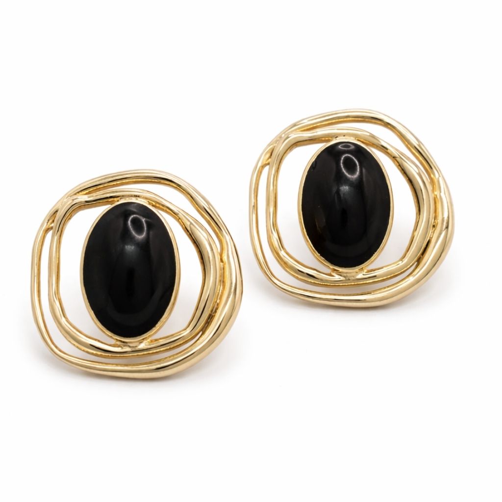 A peça é confeccionada em metal banhado, com design escultural composto por linhas fluidas que envolvem um elemento oval central pintado à mão na cor preta. Cada brinco carrega sutis variações naturais da pintura manual, tornando cada peça única.