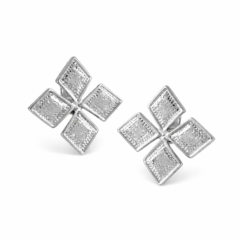 Este brinco de pressão exibe um design moderno e simétrico com quatro losangos em relevo, formando uma peça marcante e atemporal. Com banho prateado de alta qualidade, ele proporciona um acabamento sofisticado, ideal para compor looks elegantes com personalidade.
