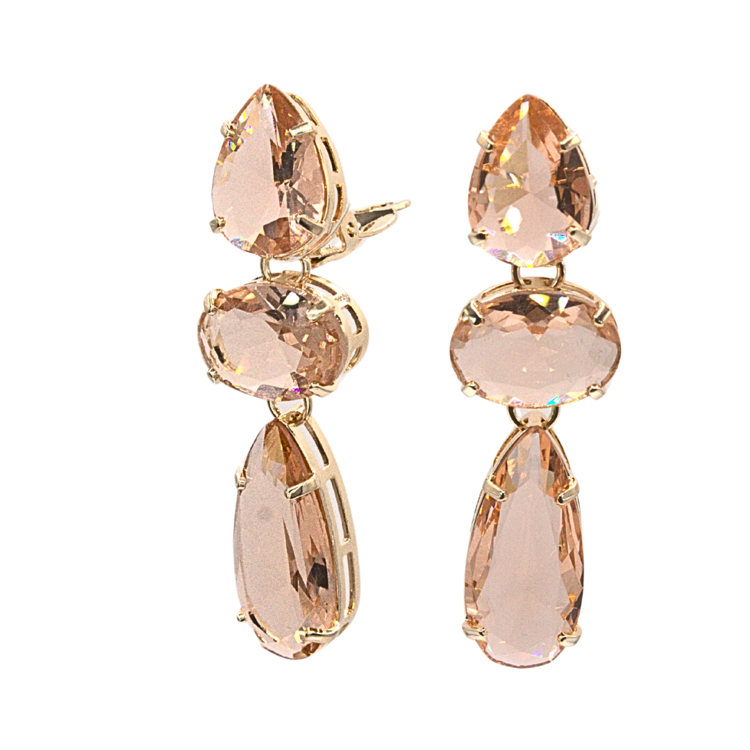 Composto por 3 pedras de zircônia champagne cravadas, o brinco traz uma pedra em formato de gota na base, uma zircônia oval no entremeio, e finaliza com um pingente alongado, que proporciona movimento delicado e charme adicional ao design.